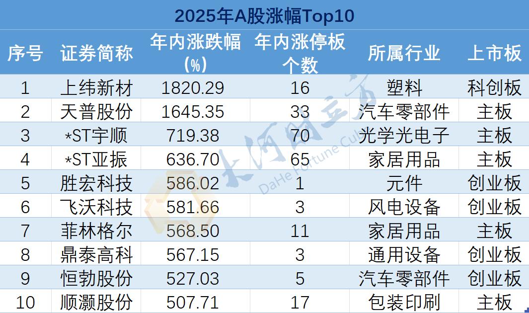 上纬新材全年上涨1820%,领跑A股涨幅榜。天普股份年度涨幅1645%次之。两家公司均受益于重组收购事项——智元机器人拟收购上纬新材至少63.62%股权,而汽车零部件企业中昊芯英拟要约收购天普股份实现控股。重组利好刺激下,上纬新材全年走出16个涨停板,而天普股份涨停板数则达到33个。